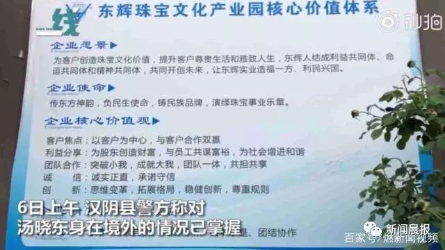 汤晓东究竟做了什么?2019年1月,汉阴县人民政府曾回复网上信访称:2018年10月4日,县公安局陆续接到本县大规模群众报案,称汉阴县城关镇东辉珠宝玉器店向社会公众进行非法集资,警方在10月7日立案侦查,相继抓获东辉珠宝非法吸款案10名涉案骨干人员,查封东辉珠宝公司涉案人员房产6处,查封位于涧池镇工业园区的东辉珠宝产业园1处及汉阴辖区东辉珠宝玉器店2个;扣押珠宝玉石半成品4吨,翡翠原石14.67吨,翡翠饰品35箱,玉器等各类物品31包装箱,大摆件21件,吊坠等小饰品700余件,金银首饰及珠宝玉石1万余件,金条7根(共1291g),价值160余万元玉器一批,红木家具一组,红酒4箱,车辆10辆,白酒210件。仅仅是抓获了涉案的骨干人员,数字就已经如此触目惊心,而东辉珠宝创始人、本案的主要嫌疑人汤晓东却不见了踪影,7个月后,警方发布了高达百万的悬绳通告。