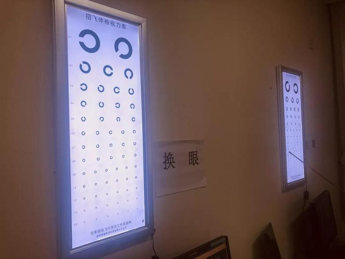 答:当前的招飞体检标准中规定,使用空军C字表,双眼裸眼远视力均在1.0以上(轰、运、直机型学员0.8以上)合格。