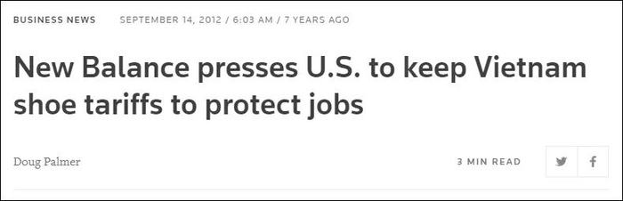 路透社:新百伦施压美国政府,要求保持对越南制造鞋类的关税,以保护就业(2012年)