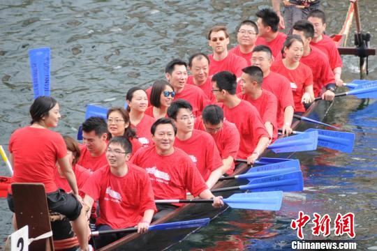 这是杜伊斯堡趣味龙舟赛上首次出现中国代表队。为突出此次参赛的精神内涵,这支参赛队伍特意将本队龙舟命名为“同舟共赢”号。虽然队员们几乎都没有划龙舟的经验,但在赛场上齐心协力、奋勇向前的表现赢得了现场观众阵阵热烈掌声。