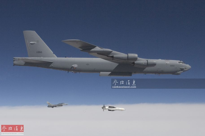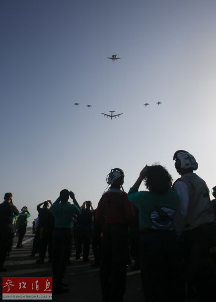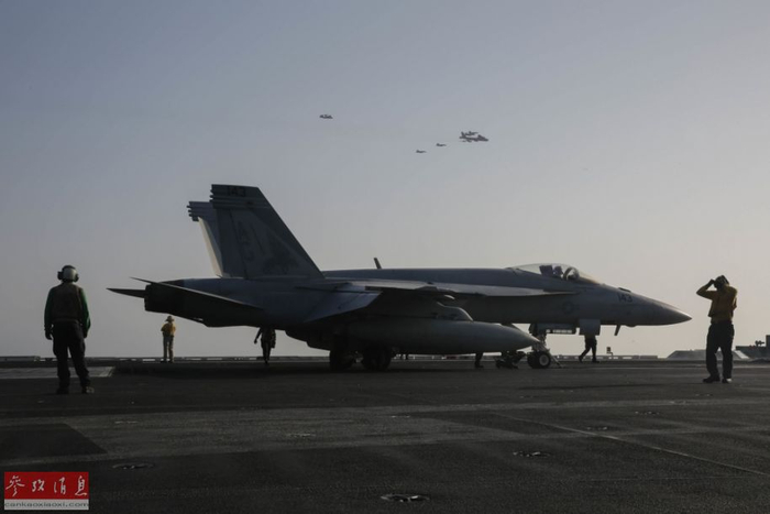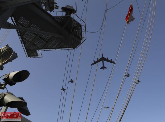 6月1日,美空军一架B-52H战略轰炸机与美海军“林肯”号(CVN-72)航母派出的舰载机组成联合编队,从航母打击群上空飞过,炫耀武力。当天,这架B-52H与“林肯”号打击群一同进行了“模拟联合打击”联演,针对伊朗意味明显。图为从航母甲板上拍摄的B-52H轰炸机编队飞越航母瞬间。