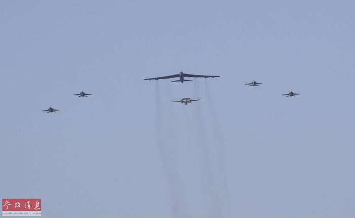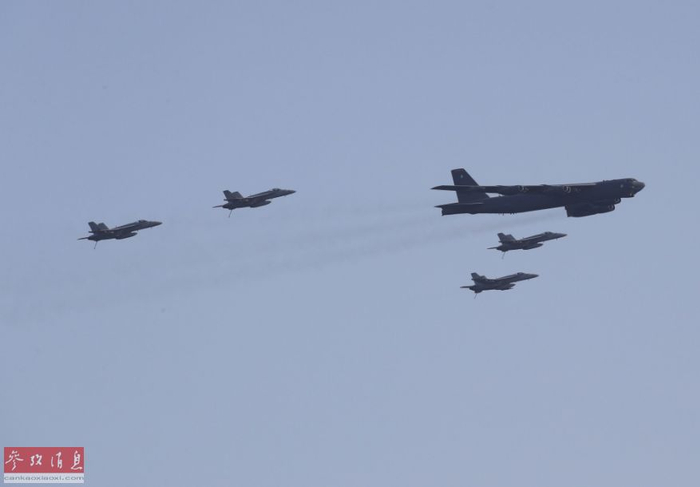 B-52轰炸机与“林肯”号航母派出的F/A-18“大黄蜂”战机、E-2C预警机一同组成联合编队。