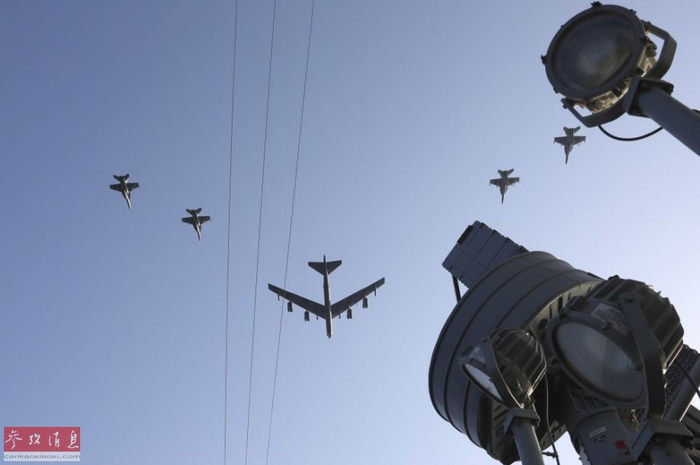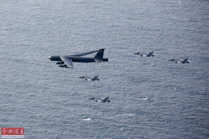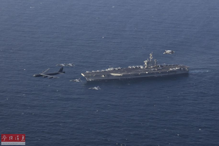 【延伸阅读】炫耀武力!美B-52飞越航母模拟攻击伊朗