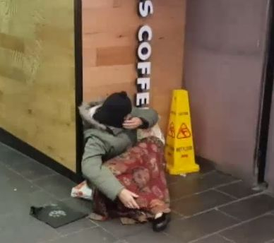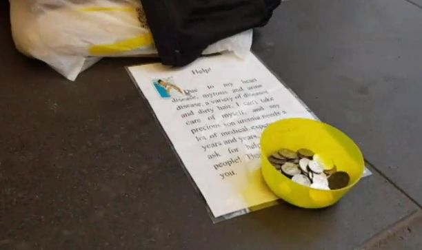 在一段视频中,乞讨者面前摆着的“求助信”写着,“由于心脏病、尿道疾病、各种疾病和脏头发,我无法自立。”