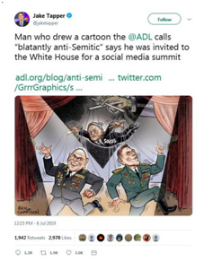 美国有线电视新闻网(CNN)记者杰克﹒泰伯(Jake Tapper)也发推特称:一名男子画了一幅被反诽谤联盟(国际性犹太人非政府组织及美国公民权利组织)称为“公然反犹太人”的漫画,而他说自己被邀请至白宫参加一个社交媒体峰会。