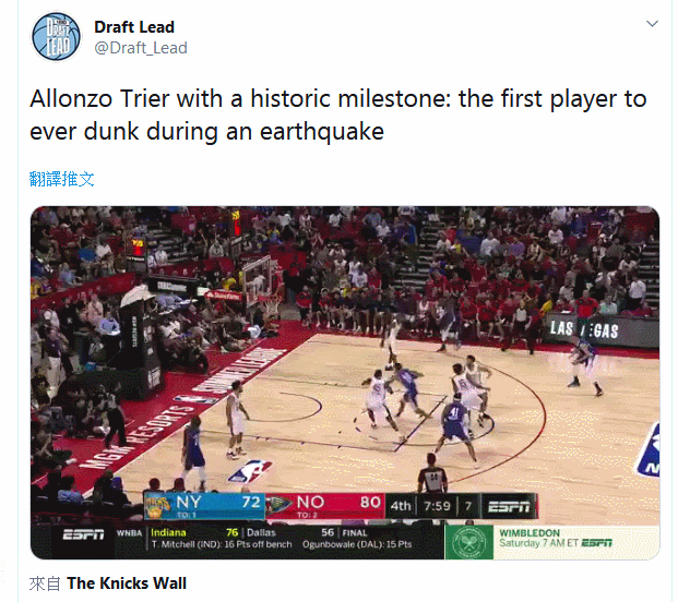地震发生时,NBA纽约尼克斯队正在进行比赛,网友Draft Lead调侃说,“阿朗佐·特里尔有了一个历史性重要瞬间,成了第一个在地震中扣篮的球员。”