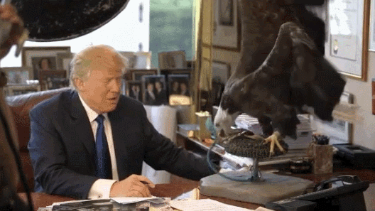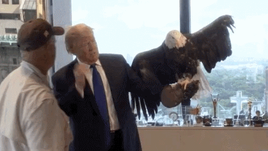 而特朗普,早在2015年做总统前,就被其他物种“攻击”过,那可比苍蝇大多了,是和他一起为《时代周刊》拍照的鹰: