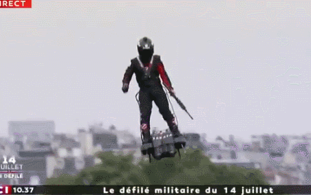 据法新社介绍,此人名叫弗兰基·扎帕塔(Franky Zapata),是飞行踏板的发明者。在14日的阅兵式上,他飞行时还手持一支步枪。法新社说,这是他的设备可能被作为军事用途的一个迹象。