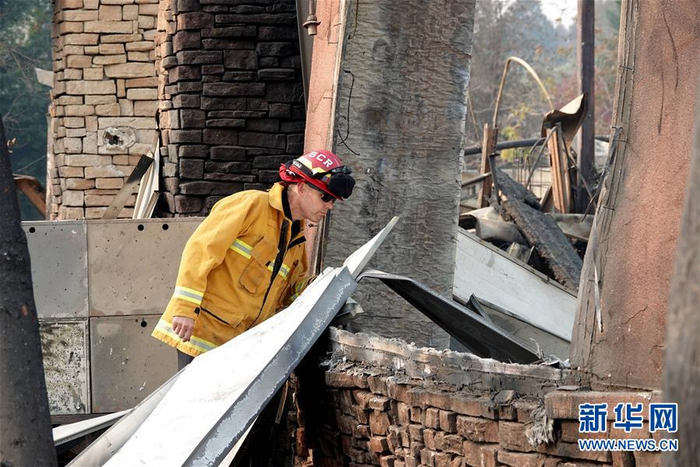 11月18日,在美国加利福尼亚州比尤特县天堂镇,救援人员在山火废墟中工作。新华社记者吴晓凌摄