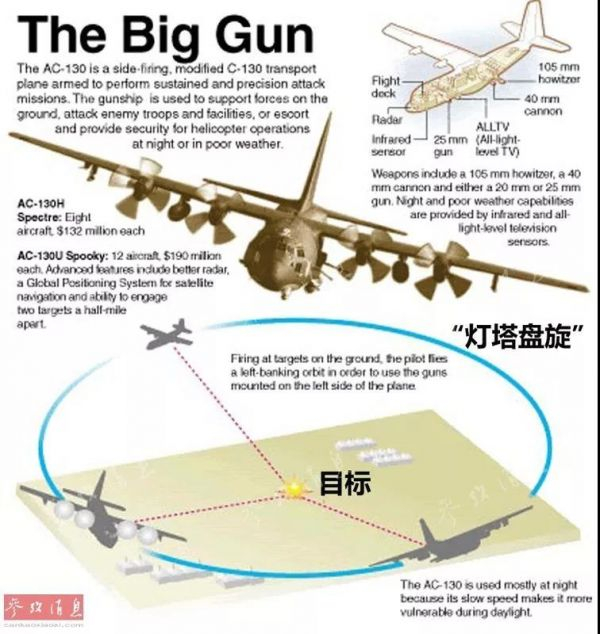 美军AC-130U炮艇机“灯塔盘旋”攻击示意图。