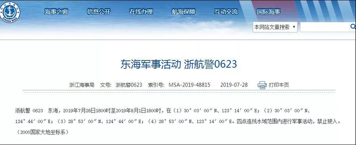 岛内多家媒体29日报道了大陆海事部门在东海和南海发布航行警告、解放军进行军事演习的消息。台湾联合新闻网称,浙江海事局28日发布“浙航警0623”航行警告,28日傍晚至8月1日晚6时在舟山岛正东89公里处进行军事活动,禁止无关船舶进入相关海域。紧接着29日晨,广东海事局进一步发布“粤航警0164”航行警告,29日清晨至8月2日晚6时在东山岛附近海域进行军事活动,“显示共军在我当面两个战区将有军事操演”。