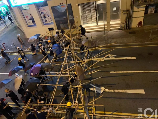 激进分子接着开始升级其暴力行为,向警察掷砖头、玻璃瓶、汽油弹,射激光、钢珠,甚至在外国组织者的指导下,制造“燃烧手推车”冲向警察防线。