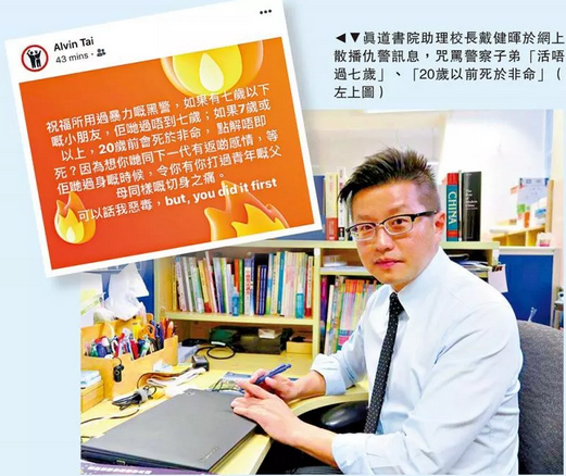 比如昨天,就有香港一学校的老师,公开恶毒诅咒港警子女。这名担任“真道书院”助理校长的戴姓男子发帖说:警察子弟“如果七岁以下,则活不到七岁”“如果七岁以上,则20岁前死于非命”。