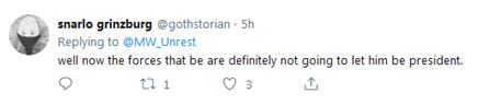 用户@gothstorian调侃:“好吧,现在(外星)势力肯定不会让他成为总统。” ↓