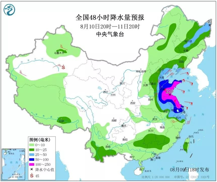 据悉,“利奇马”后期将北上,先后影响华东、华北东部及东北地区。除台风本身带来的强风雨,10日以后和冷空气结合,东部沿海地区将有大到暴雨,华东、华北、东北等8省市风大雨强。中央气象台预计,10日,浙江、江苏、上海、安徽、山东普遍会出现大到暴雨,其中,山东中部、安徽东南部、江苏北部和南部、上海、浙江北部等地部分地区有大暴雨,浙江北部局地特大暴雨。浙江北部、上海、江苏、山东南部等地的部分地区有6—8级风。