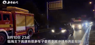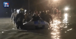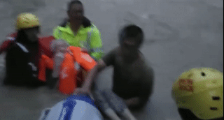 18时10分,救援人员看到一个人抱着一位没有行动能力的老奶奶,马上过去把老奶奶他们抱上橡皮艇,安置好后临海中队继续前进疏散人员。