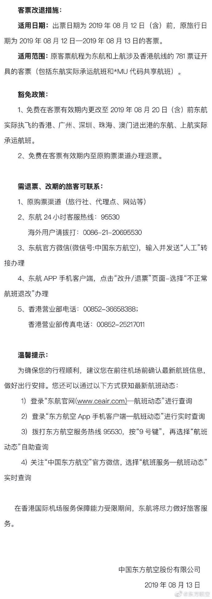 今晨,东方航空官方微博发布通告称,受香港国际机场服务保障能力限制持续影响,东航继续取消8月13日期间部分香港进出港航班10班,后续东航将根据香港国际机场运行保障情况,动态调整航班。目前取消航班信息如下图:
