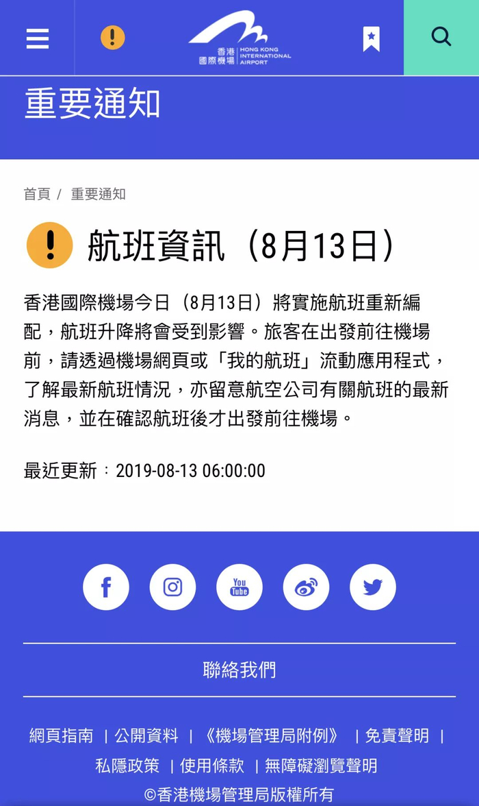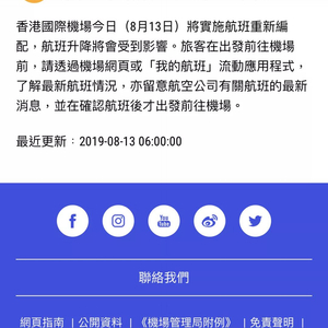 8月12日,香港国际机场发生非法集会,造成机场运作瘫痪,大量航班取消。8月13日早6点,香港机场管理局在官网上发布消息称,13日,香港国际机场将实施航班重新编配,航班升降将会受到影响。此外,国航、东航等今日均有多个进出香港的航班取消。