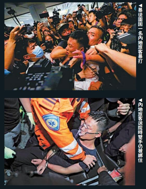 海外网8月14日电 暴徒连续第二日瘫痪香港国际机场,暴行不断令人发指!逾万名黑衣人13日中午起再次占据机场逾11小时,暴徒滥用私刑,围殴内地旅客,拳打脚踢及淋水,旅客浴血昏迷,暴徒却阻止医护人员将他送院抢救,伤者被困机场逾五小时。香港警方入夜后到场,在防暴警开路下,千辛万苦才将受伤旅客送离机场,昨晚有消息传出他无脉搏,生命危殆。到场警员变成暴徒攻击对象,有前线警员“落单”时被袭,遭暴徒叉颈围殴拳打脚踢,生命饱受威胁下一度举枪自卫。