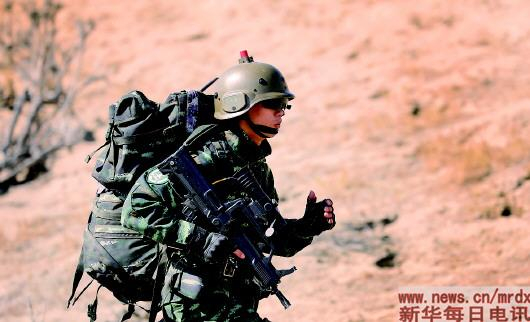 正午,烈日炙烤下的沙漠直逼60摄氏度,特战队员们手持狙击步枪、肩扛35mm榴弹发射器等,背负近20公斤的背囊,迷彩服湿了又干、干了又湿,体力消耗逼近极限。