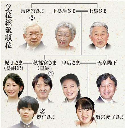 现在的皇位继承顺序分别为德仁天皇的弟弟秋筱宫文仁亲王、其儿子秋筱宫悠仁亲王及明仁上皇的弟弟常陆宫正仁亲王。但常陆宫已经年过八十,德仁天皇和弟弟秋筱宫年龄相差不大。有媒体分析称,无论秋筱宫继承皇位与否,日本天皇一脉实际上已经悬于悠仁一人身上。