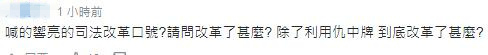 对于蔡英文大谈“政绩”,网友表示,“喊的响亮的司法改革口号?请问改革了什么?除了利用‘仇中牌’,到底改革了什么?”