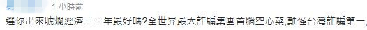 “选你出来唬烂经济二十年最好吗?全世界最大诈骗集团首脑空心菜,难怪台湾诈骗第一。”