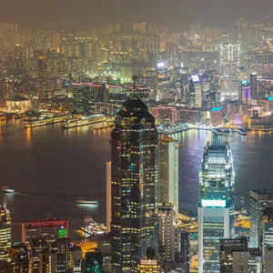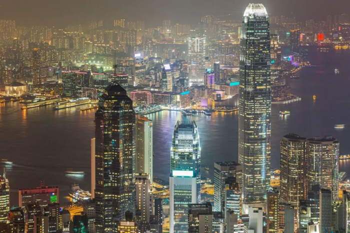 6月14日,中国香港,从太平山顶鸟瞰维多利亚港全景,高楼大厦林立,夜幕降临,香港国际金融中心(香港ifc)、香港环球贸易广场,这些地标建筑跃然眼前。来源:ICphoto