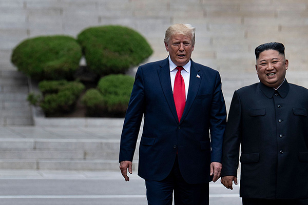 当地时间2019年6月30日,朝鲜最高领导人金正恩与美国总统特朗普在韩朝非军事区见面。视觉中国 资料