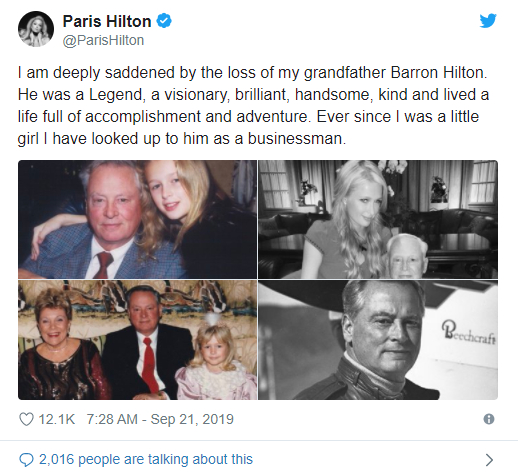 巴伦·希尔顿的孙女、好莱坞女星帕丽斯·希尔顿(Paris Hilton)在Ins上发文向祖父致敬,称“祖父是一位传奇人物,有远见、聪明、英俊、善良,过着充满成就和冒险的生活。”