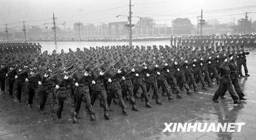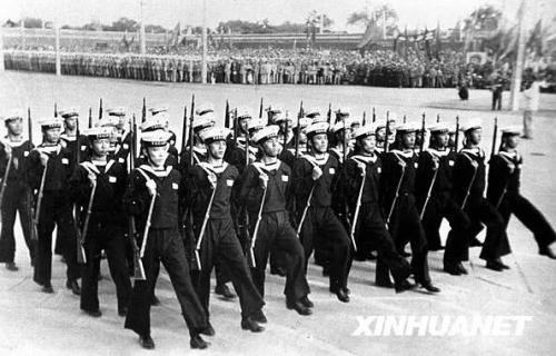 图为1949年10月1日,新组建的中国人民解放军海军方阵通过天安门广场。新华社记者 石少华 摄