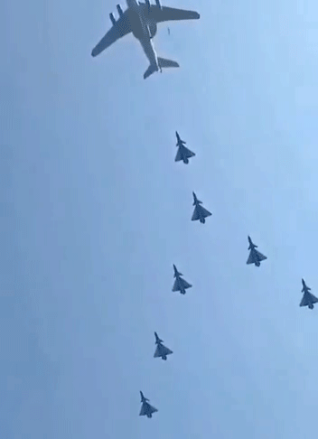 这则视频没有显示时间,从队形看是10月1日参加国庆阅兵的空中领队机梯队。该空中梯队呈箭形,九机“箭队”拉出绚烂的彩带,在视频开始有疑似物体从飞机掉落。但飞机梯队正常飞行,没有受到影响。网上有传言认为,这是空中飞行梯队在受阅过程中疑似起落架舱门掉落。
