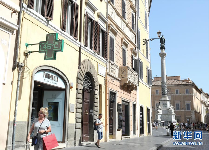 8月12日,在意大利首都罗马,一处药店的温度计显示实时温度为45摄氏度。 当日,罗马最高气温达到37摄氏度,体感温度更是一度突破40摄氏度。 新华社记者程婷婷摄