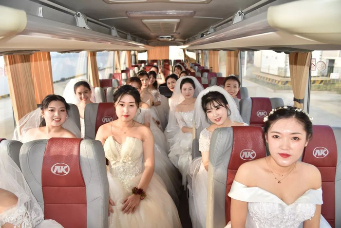 新郎穿上耀眼的礼服新娘穿上美丽的婚纱15名新郎乘船迎接新娘十指相扣踏上红地毯穿过鲜花锦簇的拱门款款步入婚礼舞台