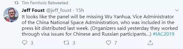 什么原因呢?石英网(QZ.com)记者Tim Fernholz在他的个人社交账号上写到,他采访了几个与会嘉宾,询问吴艳华没有到场的原因。其中德国宇航中心的一位即将接任国际宇航大会主席一职的负责人、以及国际宇航大会的主办方,都表示原因是“时间冲突”。