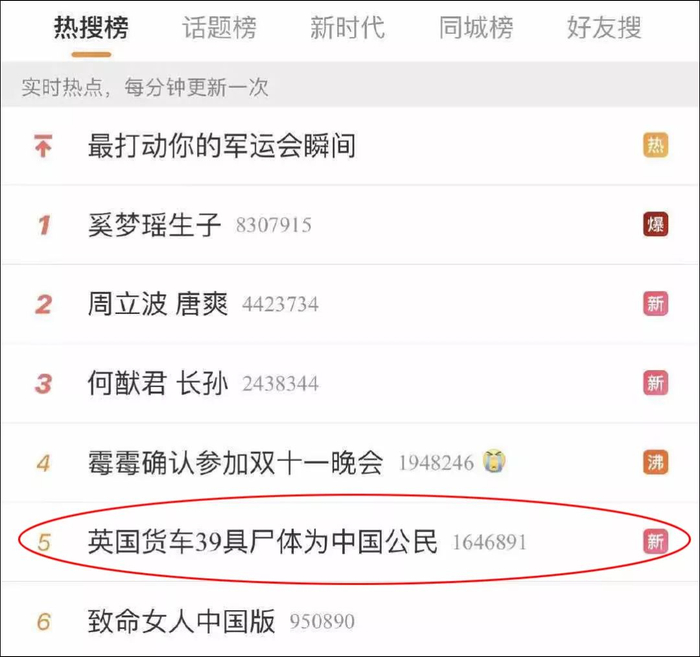 在他发布的“热搜榜”中,可以看到,奚梦瑶生子达到了“爆”的程度,而“英国货车39具尸体为中国公民”这样重大的新闻竟然只是个“新”。(注:据中国驻英国大使馆25日凌晨消息,英国警方表示正在核实遇难者身份,尚无法确定遇难者是中国国籍。)