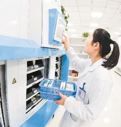 在江苏连云港市第一人民医院智慧药房,工作人员正查看智能药物存储管理分发系统运行情况。耿玉和摄(人民图片)