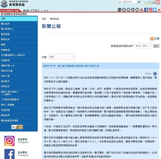 香港警方11月11日发布新闻公报