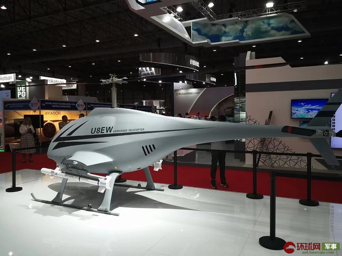 今年,除了有人军贸直升机系列外,中国航空工业以展示样机形式首秀迪拜航展的U-8EW无人直升机也非常抢眼。环球网记者在航展现场注意到,这个左右两个短翼各携带1枚天雷二号小型空地导弹的“小家伙”,不时有参观嘉宾驻足观看,询问详情。