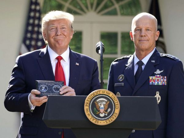 资料图片:美国总统特朗普与约翰·雷蒙德上将在太空司令部成立仪式上合影。(美国防部官网)