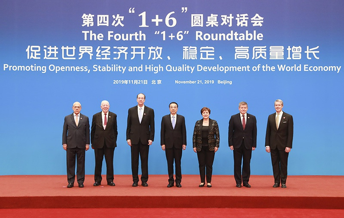 国务院总理李克强11月21日上午在钓鱼台国宾馆同世界银行行长马尔帕斯、国际货币基金组织总裁格奥尔基耶娃、世界贸易组织副总干事沃尔夫、国际劳工组织总干事莱德、经济合作与发展组织秘书长古里亚和金融稳定理事会主席夸尔斯举行第四次“1+6”圆桌对话会。会议围绕“促进世界经济开放、稳定、高质量增长”的主题,就优化营商环境和推进更高水平开放等议题深入交流。李克强表示,今年以来,受内外多种因素影响,中国经济面临的下行压力加大,但我们能够实现年初确定的经济社会发展主要目标任务。我们采取了一系列积极举措,通过不断深化改革,扩大开放,激发市场活力,顶住下行压力。中国拥有巨大市场,营商环境不断优化,发展潜力巨大。李克强指出,明年我们将保持宏观经济政策的连续性和稳定性,继续实施积极的财政政策和稳健的货币政策,给市场以稳定预期。中国绝不搞量化宽松,将用好经济逆周期调节工具,落实好今年实施更大规模减税降费,保持流动性合理充裕,加大力度降低实际贷款利率水平。致力于打造市场化、法治化、国际化的营商环境。把就业放在突出显著位置,夯实未来经济发展基础。释放内需潜力,进一步全面开放制造业,扩大开放服务业。与会国际经济金融机构负责人高度赞赏新中国成立70年来取得举世瞩目的发展成就,特别是在减贫领域的卓越贡献,使本国人民获得实实在在的利益。他们表示,中国营商环境持续优化,今年世界排名跃居第31位,再次大幅提升。各方赞赏中国进一步深化改革、扩大开放,更多发挥市场在资源配置中的决定性作用,由高速增长向高质量增长迈进。各方重视同中方的关系与合作,愿加强在金融、技术、就业、减贫、发展等领域的交流合作,取得更多惠及民众的新成果。