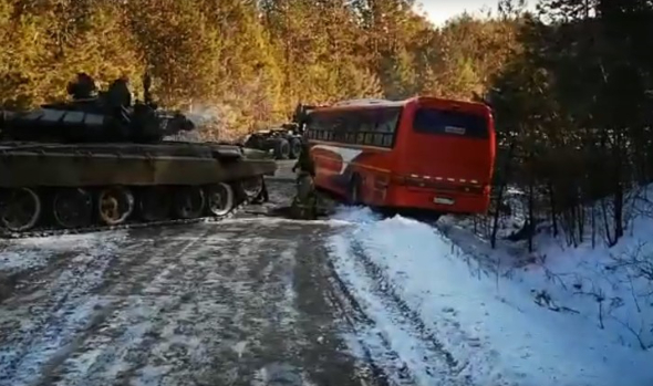 硬核营救!俄客车冲下道路落入雪沟 派来救援竟是辆坦克(图)
