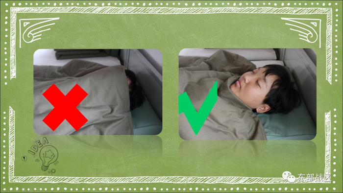 不少战友为了保暖,喜欢蒙头睡觉。其实,蒙头睡觉时,肌体呼出的大量水汽遇冷液化,导致被褥潮湿,保暖性反而下降。此外,蒙被睡觉还容易导致氧气摄入不足,影响睡眠质量。因此,睡觉时切忌蒙头,身体与被子间最好留有一定空隙。