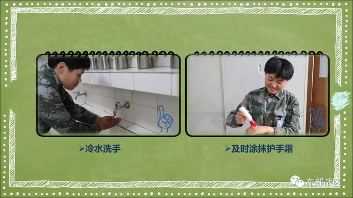 寒冷天气,很多人的手脚脸都会长冻疮,战友们不妨多做做“干洗手”的动作,即双手对搓,摩擦生热,促进血液循环而防寒,可以有效预防冻疮。