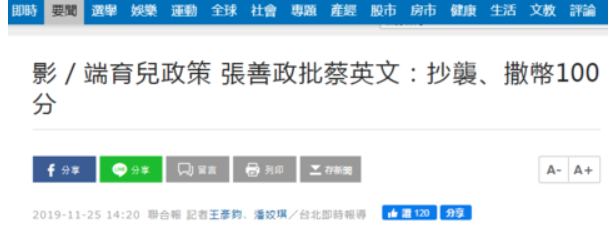 据台湾《联合报》25日报道,台当局前“行政院长”张善政也呛声,蔡英文执政三年多,只知道端出“一例一休恶法”,直斥“育儿政策”是“撒币100分”。