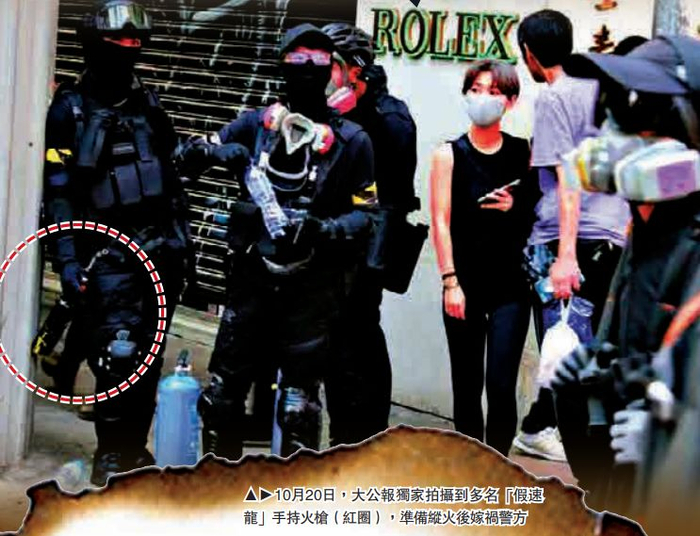 10月20日,大公报独家拍摄到多名“假速龙”手持火枪(红圈),准备纵火后嫁祸警方