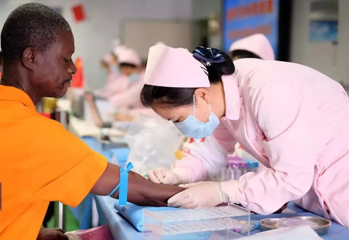 △和平方舟医护人员在主平台为加蓬民众抽血检查。江山 摄