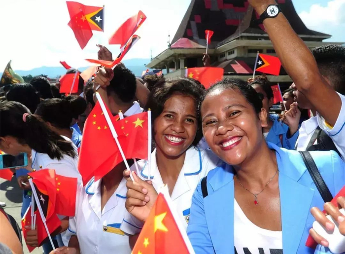 △2017年12月14日,东帝汶民众和学生挥动中国与东帝汶两国国旗欢迎中国海军和平方舟医院船首次到访。江山 摄