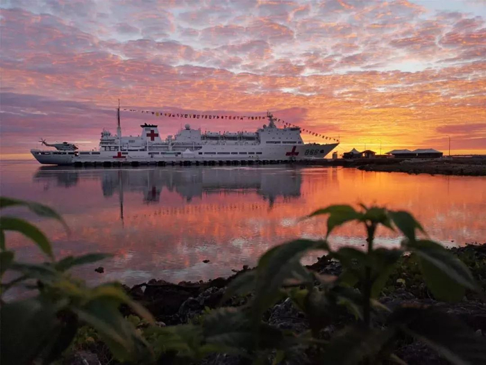 △2018年8月19日,首个“中国医师节”,在汤加努库阿洛法港,沐浴朝霞的中国海军和平方舟医院船又迎来忙碌的一天。江山 摄