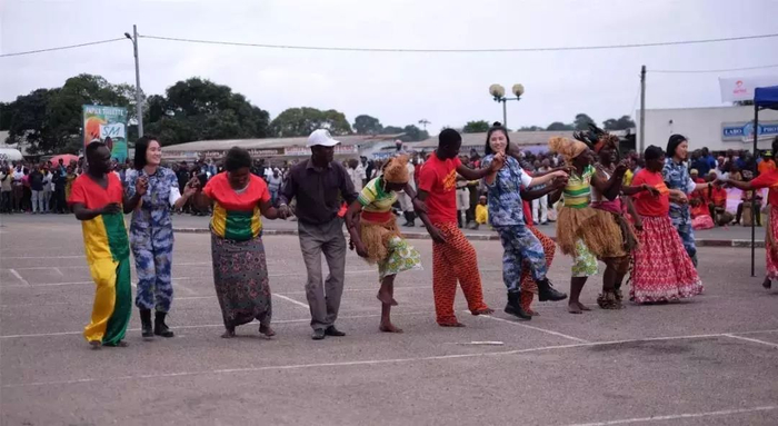 △和平方舟医院船船员与刚果民众一起跳起欢快舞蹈。江山 摄
